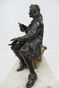 Ecole française du XIXème siècle « Molière assis, accoudé sur une demi-colonne, les titres de ses œuvres sur un parchemin déroulé » Sujet en bronze à patine brune et doré, sur un socle rectangulaire en marbre blanc veiné. (Eclats au socle). Dimensions : 32 x 39 x 18 cm.