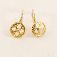 Paire de pendants d'oreilles en or 750 mil retenant un disque ajouré, rehaussé de diamants (Diam disque : 1,5 cm). 7,1 g brut.