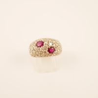 Bague jonc en platine 900 mil. ornée de 2 rubis ovales dans un pavage de diamants brillantés (TDD : 53,5). 16,2 g. brut.