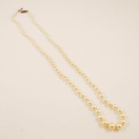 Collier d’un rang de perles de culture en chute (diamètre des perles : 3,6 à 7,15 mm environ), avec fermoir en argent 925 mil. (longueur : 51 cm environ). 13,7 g. brut.