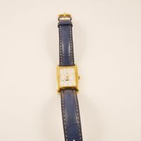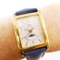 ORIS Rectangular, montre-bracelet d’homme en métal doré, boîtier rectangulaire cintré (38 x 26 mm), cadran blanc guilloché à index dorés et chiffres arabes, phase de lune et aiguille pour la date, mouvement automatique, fond de boîte transparent, sur bracelet en cuir usagé bleu à boucle ardillon en métal doré.