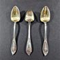 ALPHONSE DEBAIN, période ART NOUVEAU : suite de 12 petites cuillers en argent 950 mil. et cuilleron vermeil, modèle à médaillon mouluré de feuilles de ginko. Minerve 1er titre de 1838 et poinçon de Maître à la bécasse (actif 1883-1911). Poids : 285 g. L. 13.5 cm. Non chiffrée. Ecrin postérieur. Ce modèle typiquement Art Nouveau est original pour la forme particulière du cuilleron en triangle.