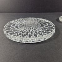 BACCARAT, Années 1960 : service vintage GOUTTES D’EAU en cristal de 2 dessous de bouteilles (dim. 1.5 x 13.8 cm) et d’1 dessous de plat rond (dim. 2 x 22.5 cm), modèle moulé-pressé à décor de gouttes d’eau rayonnantes. Cachet. Dans leurs deux écrins BACCARAT rouges. Micro-rayures. TBE.