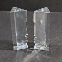 BACCARAT par ROBERT RIGOT (né en 1929), époque contemporaine : 2 sujets « La Rencontre » en cristal figurant 2 visages stylisés. Design de Robert RIGOT, sculpteur pour Baccarat. Signés et cachet moderne. H. 13 cm. Largeur du dos : 3.5 cm. Côtés des triangles : 4.3 et 4.4 cm. TBE. De 1966 à 1996, RIGOT est le conseiller artistique de la maison. I Il existe une version en serre-livres de 26 cm de hauteur de ce modèle.