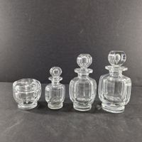 BACCARAT, XXe siècle : garniture de toilette MALMAISON de 4 pièces rondes en cristal taillé à pans sur petit piédouche circulaire comprenant 3 flacons (H. 18.7 cm, 17.8 cm et 13.3 cm) 1 pot couvert (9 x 8 cm). Cachet de la maison. Légères rayures. TBE.