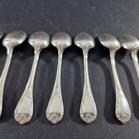 CHRISTOFLE, MARLY, ante 1983 : suite de 12 cuillers à moka ou à espresso selon l’appellation de la maison en métal argenté à décor rocaille. Signée. Poinçon période 1935-1983. Production moderne. L. 10 cm. Non chiffrée. TBE. La cuiller à espresso est vendue 70 euros à l’unité actuellement soit 840 euros l’ensemble.