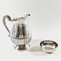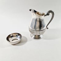 CHRISTOFLE, XXe siècle, ante 1983 : - Broc à eau (ou pot à orangeade) en métal argenté à piédouche rond et panse godronnée, l’anse volute amatie à palmette. Barrière en accolade pour retenir les glaçons. H. 23.5 cm. - Coupelle apéritive ronde lisse. Dim. 4 x 11.5 cm. Signés. Poinçon période 1935-1983. Production moderne. Légères rayures. TBE.