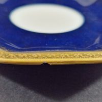 DEPIERREFICHE, Limoges, XXe siècle : tasse à déjeuner ronde (H. 6.2 cm – diam. 10.7 cm.) et sa sous-tasse à pans (diam. 16.4 cm) en porcelaine bleue lapis, blanche et or à décor de rinceaux feuillagés et fleurons. Cachet de la Porcelaine Limousine et du revendeur dans les années 1960. 2 petits éclats sous la tasse.