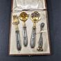 EMILE BERGERON, Années 1900 : service à bonbons 4 pièce en argent 950 mil., argent fourré et métal bicolore de style Louis XVI à lauriers comprenant 1 pince à sucre, 1 pelle à petits fours, 1 fourchette à fruits confits et 1 cuiller à sucre. Minerve 1er titre de 1838 et poinçon de Maître et de fabricant (enregistré en 1902). Poids brut : 156.7 g dont 34.6 g pour la pince à sucre. Dans son écrin d’origine défraichi. L. 12.5 à 17 cm. Non chiffré. TBE de fraicheur