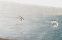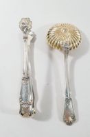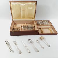 HENIN & CIE, début du XXe siècle : Ménagère de 50 pièces en argent 950 mil. modèle filet violoné à agrafes feuillagées et coquille comprenant 12 grandes fourchettes et 12 grandes cuillers chiffrées GM, 12 petites cuillers non chiffrées, 12 couteaux à fromages lames argent (non chiffré sauf 1 couteau), 1 cuiller saupoudreuse chiffrée MP et 1 pince à sucre chiffrée MD. Minerve 1er titre de 1838 et tête de Mercure 1er titre (sauf 2e titre pour 1 lame de DOUTRE ROUSSEL) avec le poinçon de retour à la tête de lièvre. Poinçon de Maître d’Henin & Cie enregistré en 1896. Quelques couteaux d’Henin & Vivier (actif 1891-1896) et 2 lames Linzeler & Cie. Poids net des grands couverts, cuillers à café et des 2 pièces de service : 2330 g. L. d’un couvert : 21.5 et 21.3 cm. Poids brut des couteaux à manches fourrés : 531.4 g. L. 20.1 cm. Rayures d’usage. TBE. + Ecrin Cailar-Bayard moderne.
