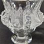 LALIQUE France, production contemporaine : paire de vases DAMPIERRE en cristal moulé-pressé incolore à décor poli et satiné de moineaux et roses, de forme Médicis sur base ronde. Signés à la pointe sous les bases et numérotés K0635 et K3057. H. 12.5 cm. Diam. 11.8 cm. 2 boites grises défraichies. TBE. Quasi-neuf. Modèle de MARC LALIQUE crée en 1948.