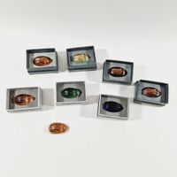 LALIQUE France, production contemporaine : Suite de 8 SCARABEES en cristal moulé-pressé de couleur bleu, rose, ambre, gris et vert, 5 irisés à effet bronze ou or. Signés Lalique France à la pointe. L. 5.6 cm. 7 boites grises Lalique Paris. TBE. Quasi-neuf. Modèle crée en 1994 par Marie-Claude LALIQUE. Le motif du scarabée symbole porte-bonheur de chance et de renaissance a été souvent utilisé par René Lalique (1860-1945) au début du XXe siècle.