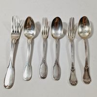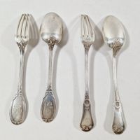 Lot de couverts en argent 1er titre 950 mil. comprenant : - 1 fourchette de table du XVIIIe siècle à filet. Poinçons XVIIIe. Exemptée art. 524 bis al. a du CGI. Chiffre XIXe. L. 20.3 cm. 78.9 g.- 1 cuiller à entremets à filet Paris 1819-1838 (Vieillard 1er titre et garantie) par GFeR pour GODOT femme Victoire-Joséphine RIVET (active 1832-1836). Minerve de 1838. Chiffrée. L. 17.9 cm. 46.4 g. - 7 cuillers et 4 fourchettes à entremets de différents modèles et orfèvres dont H. SOUFFLOT, E. PUIFORCAT, P. QUEILLE, L. COIGNET, V. BOIVIN, J. GRANVIGNE, R. BEUNKE. Chiffrées sauf 2 fourchettes et 3 cuillers. Minerve de 1838. Poids : 511.2 g. L. 16.8 à 18.7 cm. Poids total : 636. 5 g. Rayures et usures d’usage.
