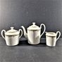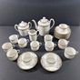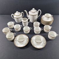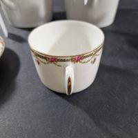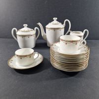 M.L.V. France, premier tiers du XXe siècle : service à thé de 27 pièces en porcelaine de Limoges blanche et or à décor de guirlandes de roses, comprenant 1 théière (H. 18 cm), 1 sucrier couvert (H. 14.5 cm), 1 pot à lait (H. 11.2 cm), 12 tasses (dim. 5.2 x7.6 cm) et 12 sous-tasses (diam. 14.8 cm). Signées. Petit éclat sur le col d’une tasse. TBE de fraicheur.