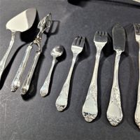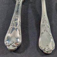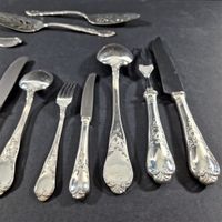 MAISON OKA, ALLEMAGNE, XXe siècle : ménagère en métal argenté de 123 pièces, modèle rocaille chantournée à rinceaux feuillagés, comprenant 10 grandes fourchettes, 10 grands couteaux, 8 fourchettes et 8 cuillers à entremets, 12 couteaux à fromage, 11 fourchettes et 12 couteaux à poisson, 12 fourchettes et 12 couteaux à fruits, 12 fourchettes à gâteaux, 11 cuillers à moka, 1 louche, 1 pince à petits fours, 1 pelle à tarte, 1 cuiller à servir (L. 24.5 cm), 1 service à découper 2 pièces. Légères rayures. TBE. Non chiffrée. L. des couteaux : 23.8 cm, 20.7 cm et 17.5 cm. L. d’une grande fourchette : 21 cm. + 2 pelles de service ajourées en métal argenté de la maison ROGERS américaine, XXe siècle. Non chiffrées. TBE. L. 24 cm.
