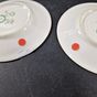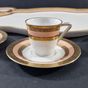 ROBERT HAVILAND, Années 1920-1930 : partie de service à café en porcelaine de Limoges blanche et rose à décor or de lauriers et rinceaux feuillagés comprenant 5 tasses, 9 soucoupes et 1 plateau rectangulaire chantourné. Cachet de Robert Haviland sur les soucoupes. Cachet Unique de Limoges de l’Union des Fabricants de porcelaine de Limoges crée en 1929. Cachet UC à la couronne de Lauriers. Eclats sur 2 soucoupes. Légères Usures à la dorure et rayures sur le plateau. TBE de fraicheur. Diam. soucoupes : 11.5 cm. H. tasse. 5 cm. Dim. plateau : 41.6 x 33.2 cm. Bibliographie : Edith MANONNI « porcelaine de Limoges », Massin, 1993. Le plateau de ce service peut servir de plateau à fromages pour un "mix & match" renouvelé.