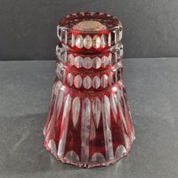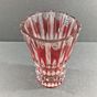 SAINT-LOUIS, XXe siècle : vase vintage en cristal à overlay rouge de sur fond transparent de forme cornet. Décor de feuilles lancéolées sur une triple bande pastillée. Petits éclats sur les bordures externes du col et légères rayures. BE de fraicheur. H. 24.8 cm. Diam. au col : 19.8 cm. Etiquette noire Cristal SAINT LOUIS France.