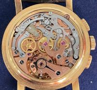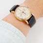 OMEGA. Montre bracelet d’homme chronographe en or jaune 750 mil., boîtier rond (diamètre : 35 mm environ), cadran crème à index appliqués, aiguilles dauphines dorées, 3 compteurs secondaires, mouvement mécanique, sur bracelet en cuir usé et boucle ardillon non signée en métal doré. Signée. N°15147160. Poids brut : 49,5 g. Sans écrin ni papiers. (Piqûres au cadran, verre rayé, ne démarre pas, en l’état, révisions à prévoir). (Longueur totale : 22,5 cm).