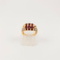 Petite bague Tank à rouleaux en or 750 mil sertie de lignes de rubis calibrés et ronds épaulés de pavages de diamants brillantés, porte un numéro à l’intérieur. (Egrisures, trace de mise à grandeur). (TDD : 43 environ). 5,2 g. brut
