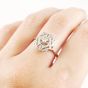 Bague en or gris 750 mil. et platine 950 mil. à décors géométriques, sertie de roses et centrée d’un diamant TA (éclats). (Largeur : 1,2 cm environ) (TDD : 57) (trace de chiffrage « pog »). 2,3 g. brut.