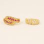Lot comprenant une bague bandeau deux ors 750 mil sertie de diamants 8/8 et 16/16. (TDD : 51) et une bague en or 750 mil sertie de trois lignes de diamants 16/16 et de deux lignes de pierres imitation rouge (Largeur : 1,1 cm environ) (TDD : 54). 8,5 g. brut.