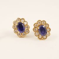 2 paires de boucles d'oreilles fleur en or 585 mil ornées de pierres de couleur et de pierres imitation (manque systèmes). 5,5 g brut.
