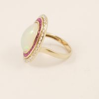 Bague en or gris 750 mil centrée d'un cabochon d'opale entouré d'une ligne de rubis calibrés et d'une ligne de diamants, signée BRANAR (Dim chaton : 2,5 x 2,1 cm environ) (TDD : 53,5). 7,5 g brut.
