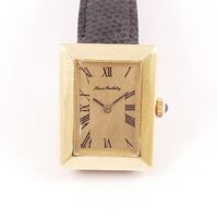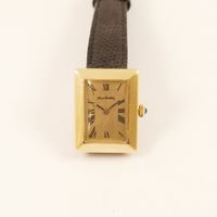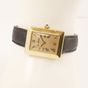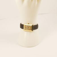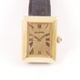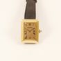 Montre de dame en or 750 mil sur bracelet cuir usagé, boîtier rectangulaire à large lunette (Dim : 28 x 22 mm nviron), cadran doré à chiffres romain, Alexis BARTHELAY, mouvement quartz rapporté (Rayures). 23,4 g brut.