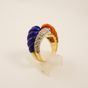 Bague double jonc 2 ors 750 mil. à décor symétrique composé de lapis lazuli et de corail godronnés entre 2 pavages de diamants brillantés (TDD : 54) (légère déformation). 9 g. brut.
