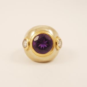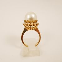Bague en or 585 mil. ornée d’une importante perle de culture dans un entourage de diamants taille brillant (TDD : 52) (diamètre perle : 12 mm environ). 8 g. brut