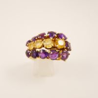 Bague en or 750 mil. à décor asymétrique, ornée d’améthystes et de citrines rondes (TDD : 62) (dimensions chaton : 2,8 x 1,9 cm environ) (égrisures, 3 améthystes cassées, usures aux griffes). 12,6 g. brut
