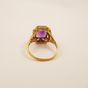 Bague en or 750 mil. à décor ciselé et ajouré, ornée d’une améthyste rectangulaire à pans coupés entre 4 petits diamants taille brillant (TDD : 64,5) (largeur : 1,6 cm environ). 5,3 g. brut