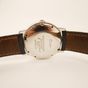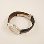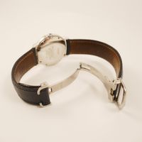 MUST DE CARTIER « Must II ». Montre-bracelet en argent 925 mil., boîtier rond à lunette plate et lisse (diamètre : 32 mm), cadran blanc et gris clair à chiffres romains noirs, petite seconde à 6 H, mouvement à quartz, sur bracelet en cuir marine usagé à boucle déployante en acier signée. (Lunette rayée). 47,5 g. brut. Avec écrin, certificat et livret.