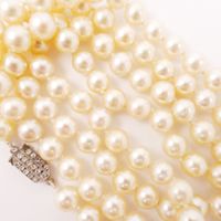 Sautoir de perles de culture, fermoir en métal serti de pierres imitation (longueur : 122 cm environ) (diamètre : entre 6,5 et 6,7 mm environ). 69,9 g. brut