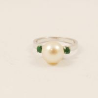 Bague en or gris 750 mil et platine 850 mil centrée d'une perle de culture épaulée de 2 émeraudes (Diam perle : 8,3 mm environ; TDD : 50,5). 3,1 g brut.