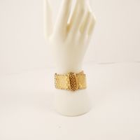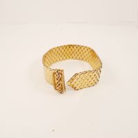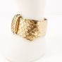 Bracelet manchette en or 750 mil à maillons façon écaille (Long : 17 cm; Larg : 2,6 cm environ), fermoir ajouré en résille avec 8 de sécurité. 91,3 g.