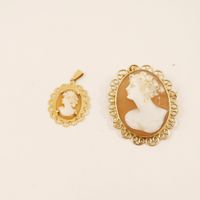 Broche-pendentif en or 750 mil ornée d'un camée coquille figurant le profil d'une femme coiffée (Dim : 4,3 x 3,6 cm environ) (petits fêles) et Pendentif en or 750 mil orné d'un camée coquille figurant un profil féminin (Dim : 2,4 x 2,2 cm environ). 12,1 g brut.