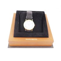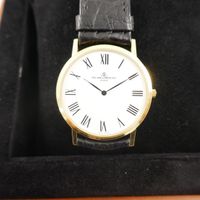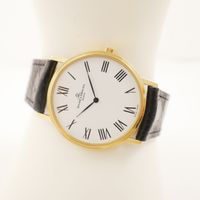 Montre d'homme en or 750 mil sur bracelet cuir usagé, boîtier rond (Diam : 32 mm), cadran blanc à chiffres romain, tour de bras en cuir usé, BAUME et MERCIER, Classima, moiuvement quartz (boucle ardillon en or 750 mil siglée; dans son écrin, sa surboîte, son livret et sa garantie). 24,5 g brut.