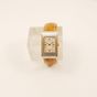 Montre en acier et métal doré, de dame sur bracelet cuir usagé, boîtier rectangulalire cannelé (Dim : 18 x 29 mm), cadran argenté à chiffres romain et index bâton, bracelet cuir usagé réglable (Long : 15 cm) avec sa boucle en métal doré, BOUCHERON, Reflet, mouvement quartz.