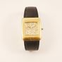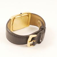 Montre en or 750 mil sur bracelet cuir usagé, boîtier rectangulaire arrondi (Dim : 28 x 34 mm), cadran fantaisie de 2 tons, GERALD GENTA pour Frohmann, mouvement mécanique signé Ebel-Gerald Genta, boucle argillon en or 750 mil siglé (rayures). 47,9 g brut.