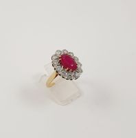 Bague pompadour en or 750 mil. centrée d’un rubis chauffé taille ovale de 4 carats environ en double serti griffe dans un entourage de diamants brillantés. (TDD : 58,5). 7,8 g. brut.