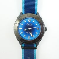 ALPINA, Seastrong Diver Gyre. Montre-bracelet d'homme de plongée en acier et matière composite noire, boîtier rond, lunette tournante unidirectionnelle graduée, cadran en dégradé de bleu à index points et bâtons luminescents, guichet dateur à 3H, mouvement automatique, sur bracelet nato à boucle ardillon en métal noirci siglée. Signée et numérotée, édition limitée n°0003/1883. (Diamètre : 38 mm). [ALPINA cherche à soutenir la cause environnementale avec cette édition limitée en recyclant du plastique issu des océans. Le terme " gyre " du modèle fait référence à un système de courant marins connu pour piéger les déchets plastiques. Le boîtier noir mat de Seastrong Gyre est fabriqué à partir d'une combinaison de fibres de verres de filets de pêches abandonnés et de plastique recyclé.]