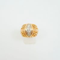 Importante bague bandeau bombée en or 750 mil. et platine 850 mil. à décor ajouré d'arabesques, centrée d'une ligne de diamants taille ancienne entre deux godrons. (TDD : 53). 13 g. brut