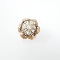 Bague "fleur" en or 375 mil. centrée d'une rosace sertie de diamants brillantés (le principal : 0,20 ct environ) (TDD : 51,5) (diamètre du chaton : 2,1 cm) (soudures, légères déformations). 7,8 g, brut.