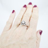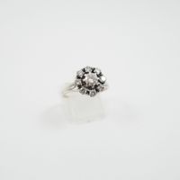 Bague fleur en or gris 750 mil. et platine 950 mil. centrée d'un diamant brillanté de 0,30 ct environ entouré de diamants taille 16/16 (TDD : 57,5) (griffes cassées et usées, trace de mise à grandeur, salissures). 3,6 g. brut.