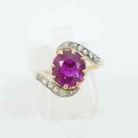 Bague "volutes" en or 750 mil. et argent 800 mil. ornée d'un corindon rose ovale de 1,70 ct environ en serti griffes épaulé de lignes sinueuses 49,5) de roses (TDD : 49,5) (égrisures, fêle). Travail fin XIXème, début XXème. 3,6 g. brut.