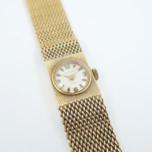 Montre de col en or 750 mil., le cadran blanc à chiffres romains noirs, le dos orné d'un motif floral ciselé serti de roses (diamètre : 24 mm) (remontoir accidenté). 13,3 g. brut.
