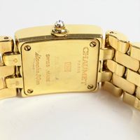 CHAUMET, Khesis. Montre de femme en forme de ruban. Boîtier en or jaune 750 millièmes, brancards sertis de diamants, signé et numéroté 11K0874. Cadran doré, partie centrale et index sertis de diamants. Mouvement quartz. Dimensions : 18 × 28 mm environ. Bracelet intégré en or jaune 750 millièmes avec boucle déployante signée. Poids brut : 93,6 g. Sans écrin ni papiers.