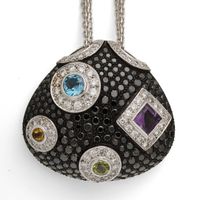 Collier trois rangs articulés en or gris 750 millièmes retenant un pendentif en or gris 750 millièmes entièrement serti de pierres fines et diamants ronds de taille brillant, certains de couleur fantaisie noire. EDOUARD NAHUM pour le pendentif. Longueur : 69 cm Hauteur du pendentif : 3,5 cm Poids brut : 42,7 g (À noter : les diamants de couleur n’ont pas été testés pour l’origine de leur couleur naturelle). E) (art. 524 bis du CGI, al. C)