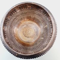 ASIE DU SUD-EST, XXe siècle : Grande coupe libatoire en argent repoussé 800 mil richement decorée de fleurs de lotus, de feuillages, et de chiens courants dans des cartouches. Cygne français. Poids : 1100,5 g. H. 16 cm. Diam. 33 cm. Petits chocs .